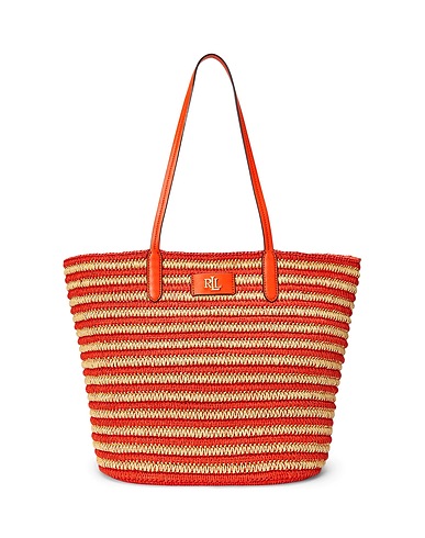 shopper bag, straw, striped, brand logo, unlined, detachable interior pouch, double handle, maxi size, contains non-textile parts of animal origin