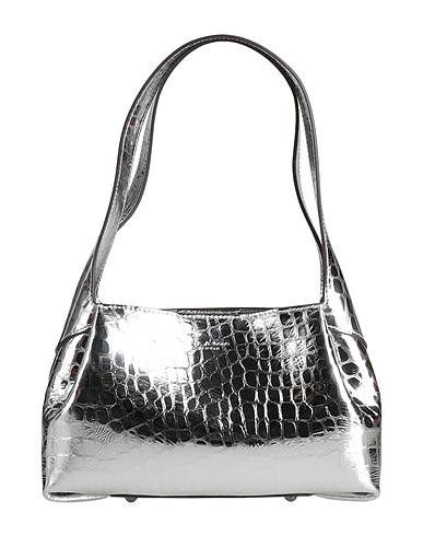 handbag, leather, metallic, crocodile-print, no appliqués, magnetic fastening, leather lining, double handle, feet at base, medium size, contains non-textile parts of animal origin