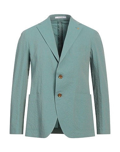 single-breasted blazer, seersucker, stretchy fabric, solid color, brooch, lapel collar, long sleeves, buttoned cuffs, unlined, button fastenings, patch pockets, one chest pocket, dual back vents, dry clean, do not bleach, do not tumble dry