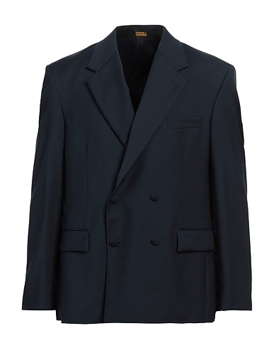 double-breasted blazer, cool wool, solid color, no appliqués, lapel collar, long sleeves, fully lined, button fastenings, flap pockets, one chest pocket, dual back vents, raw-cut hem, machine wash, do not bleach, do not tumble dry