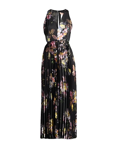 satin, belt, pleated, floral-print, v-neck, sleeveless, hook fastenings, zipper fastening, no pockets