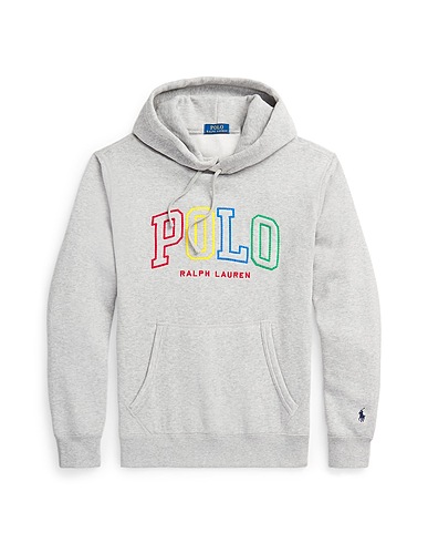 fleece, embroidered, brand logo, solid color with appliqués, hooded, long sleeves, kangaroo pocket, machine wash or dry clean, tumble dry, this brand runs large