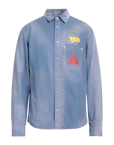 chambray, embroidered, brand logo, solid color with appliqués, colored wash, classic collar, long sleeves, snap-fastening cuffs, snap fastenings, one chest pocket, dry clean, do not bleach, do not tumble dry, designed for a loose fit