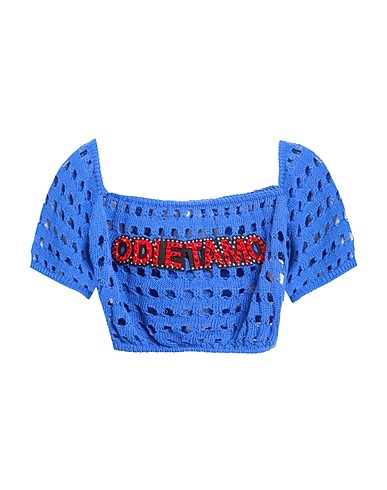 crop top, knitted, perforated, lightweight knit, solid color with appliqués, crystals, brand logo, boat neckline, short sleeves, machine wash or dry clean, do not bleach, do not tumble dry