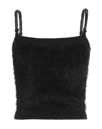 top, knitted, lightweight knit, solid color with appliqués, crystals, brand logo, scoop neckline, sleeveless, hand wash, do not tumble dry