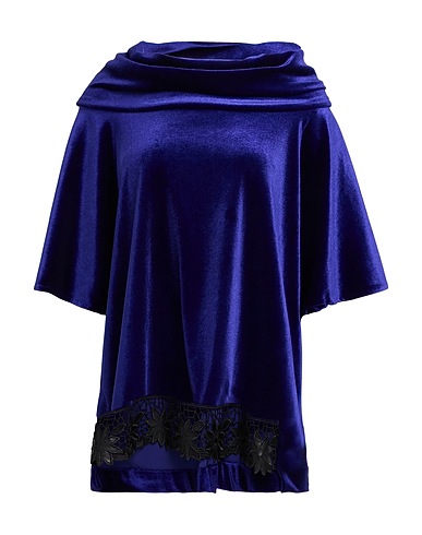 top, chenille, solid color with appliqués, lace trims, draped neckline, short sleeves, stretch, machine wash or dry clean, do not bleach, do not tumble dry