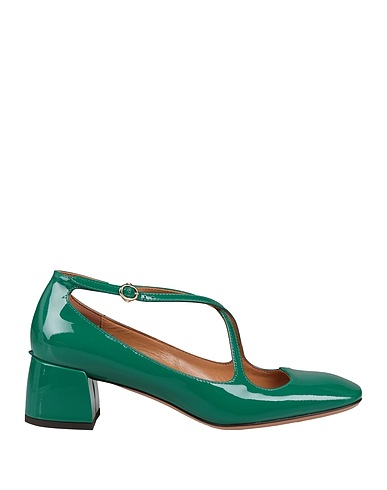 pumps, patent leather, solid color, no appliqués, leather lining, buckle fastening, elasticized inserts, square toe, square heel, covered heel, leather/rubber sole, contains non-textile parts of animal origin