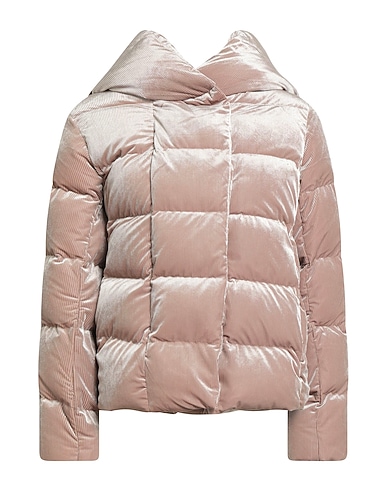 velvet, no appliqués, solid color, hooded, single-breasted , long sleeves, goose down interior, snap fastenings, zipper fastening, multipockets, stretch, contains non-textile parts of animal origin, down jacket