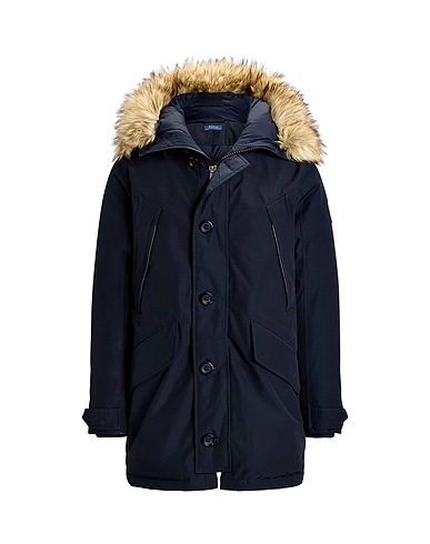 down coat, shell, solid color with appliqués, brand logo, hooded, long sleeves, duck down filling, zipper fastening, button fastenings, multipockets, contains non-textile parts of animal origin, machine wash, tumble dry