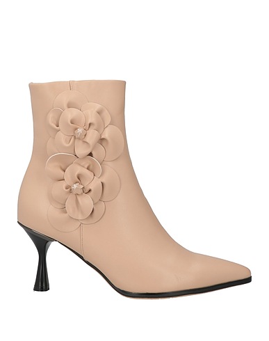 coated fabric, flower application, solid color, leather backing, zipper closure, narrow toeline, spool heel, rubber sole, ankle boots
