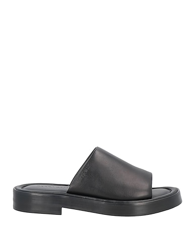 leather, nappa leather, no appliqués, solid color, leather backing, round toeline, flat, rubber cleated sole, contains non-textile parts of animal origin, large sized, slide sandals