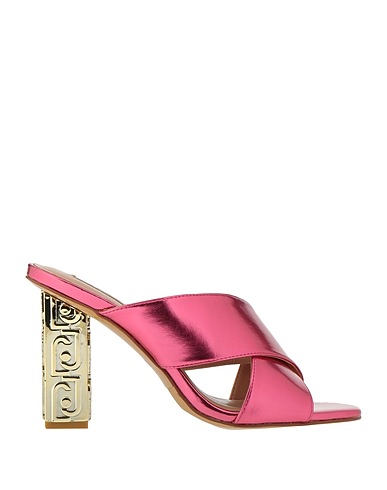 coated fabric, varnished effect, no appliqués, solid color, leather backing, square toeline, geometric heel, leather/rubber sole, sandals