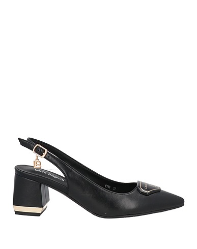 coated fabric, brand logo, solid color, fully lined, buckle fastening, narrow toeline, geometric heel, rubber sole, slingback pumps