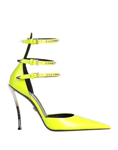 pumps, glossed-leather, solid color with appliqués, studs, leather lining, buckle-fastening ankle strap, pointed toe, stiletto heel, metal heel, leather sole, contains non-textile parts of animal origin