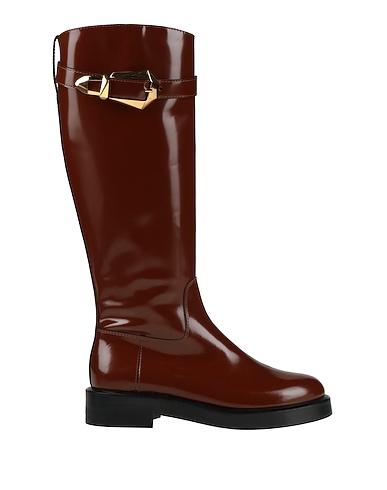 glossed-leather, buckle, solid color, leather lining, zipper fastening, round toe, square heel, leather sole, contains non-textile parts of animal origin, riding boots