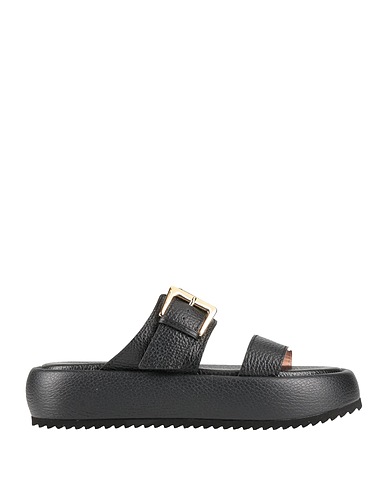 sandals, pebbled-leather, solid color, no appliqués, leather lining, buckle fastening, round toe, flat, flatform, contains non-textile parts of animal origin