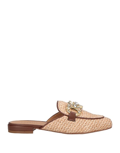 mules, coated fabric, raffia, two-tone, embellished, crystals, leather lining, round toe, flat, rubber cleated sole, contains non-textile parts of animal origin