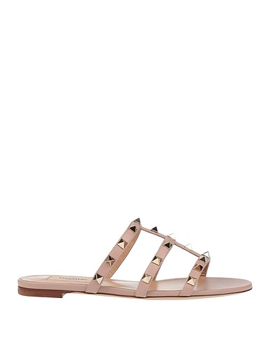 sandals, leather, solid color with appliqués, studs, leather lining, round toe, flat, leather sole, contains non-textile parts of animal origin
