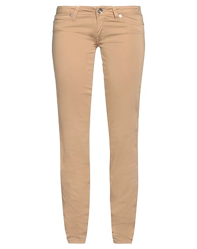 plain weave, brand logo, contrasting applications, solid color, low waisted, tapered leg, slim-leg pants, zipper closure, 1 button, five pockets, stretch, 5 pocket