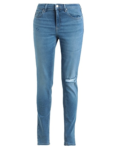 denim, distressed, brand logo, solid color, medium wash, mid rise, zipper fastening, 1 button, five pockets, stretch, skinny model