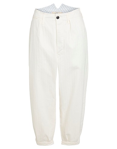 tapered pants, twill, solid color, darts, high waisted, regular fit, button fastenings, folded hem, multipockets, dry clean, do not tumble dry, cropped