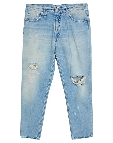 tapered jeans, denim, faded, distressed, solid color, brand logo, medium wash, high waisted, belt loops, regular fit, 1 button, zipper fastening, five pockets, machine wash or dry clean, do not bleach, do not tumble dry