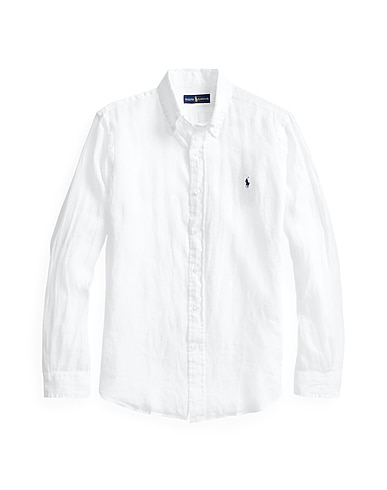 slim-fit shirt, linen, solid color, embroidered logo, button-down collar, long sleeves, buttoned cuffs, button fastenings, machine wash or dry clean, do not bleach, tumble dry, this brand runs large