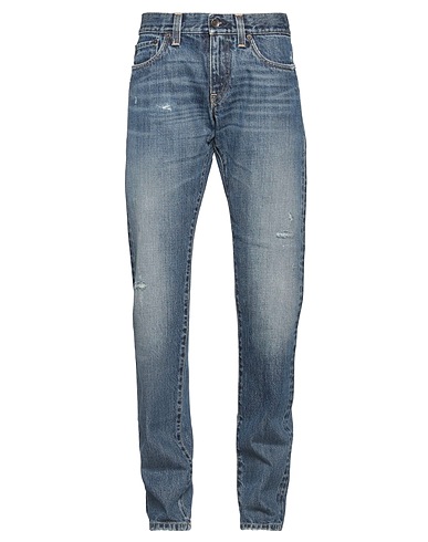 straight-leg jeans, denim, distressed, faded, solid color, leather trims, brand logo, medium wash, low waisted, regular fit, zipper fastening, 1 button, five pockets, machine wash, do not bleach, do not tumble dry, contains non-textile parts of animal origin