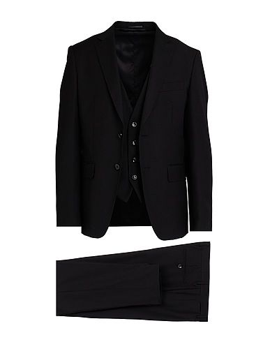 single-breasted suit, twill, solid color, no appliqués, lapel collar, long sleeves, fully lined, button fastenings, zipper fastening, multipockets, dual back vents, raw-cut hem, mid rise, 3-piece set, machine wash, do not bleach, do not tumble dry