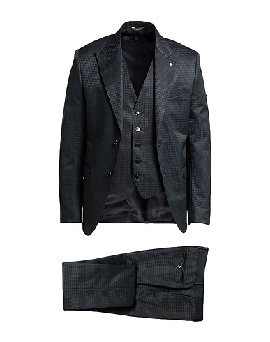 single-breasted suit, satin, solid color, brooch, lapel collar, long sleeves, fully lined, button fastenings, internal pockets, dual back vents, low waisted, 3-piece set, dry clean, do not bleach, do not tumble dry