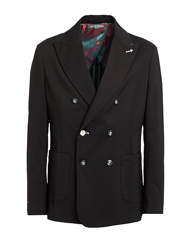 double-breasted blazer, crepe, stretchy fabric, solid color, brooch, lapel collar, long sleeves, partially lined, button fastenings, patch pockets, dual back vents, dry clean, do not bleach, do not tumble dry