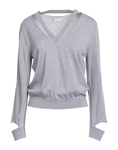 wool, lightweight knit, mélange, embroidered logo, v-neck, long sleeves, dry clean, do not bleach, do not tumble dry