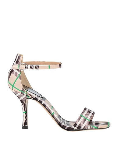 ankle strap sandals, satin, tartan pattern, brand logo, fabric inner, buckle-fastening ankle strap, square toe, spike heel, covered heel, rubber sole