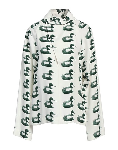 top, crepe, two-tone, no appliqués, turtleneck, long sleeves, button fastenings, snap fastenings, contains non-textile parts of animal origin, dry clean, do not bleach, do not tumble dry