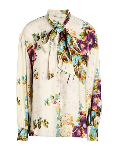 bow shirt, satin, floral-print, no appliqués, long sleeves, buttoned cuffs, button fastenings, contains non-textile parts of animal origin, dry clean, do not bleach, do not tumble dry