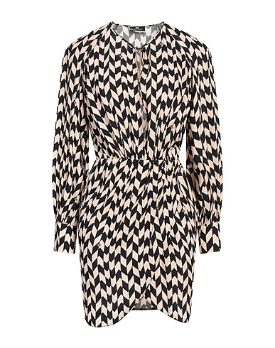 crepe, metal applications, logo design, two-tone, deep neckline, long sleeves, buttoned cuffs, internal bra, no pockets, dress