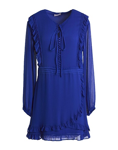 flared dress, crepe, plain colour, ruffles, crewneck, long sleeves, fully lined, tie fastening, button fastenings, hand wash or dry clean, do not bleach, do not tumble dry