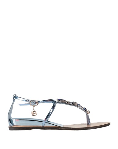 thong sandals, synthetic material, metallic, plain colour with appliqués, print, brand logo, buckle-fastening ankle strap, round toe, flat, rubber sole, fully lined