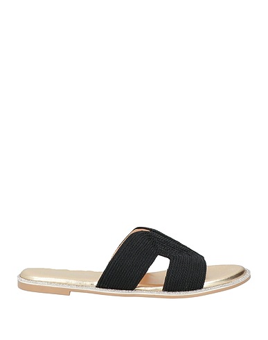 slide sandals, string, plain colour with appliqués, crystals, leather lining, round toe, flat, rubber sole, contains non-textile parts of animal origin