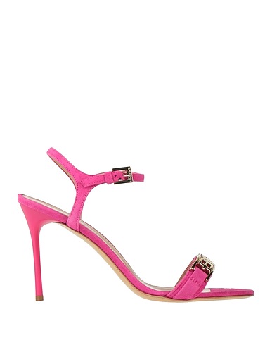ankle strap sandals, suede, plain colour with appliqués, brand logo, leather lining, buckle-fastening ankle strap, round toe, spike heel, leather sole, contains non-textile parts of animal origin