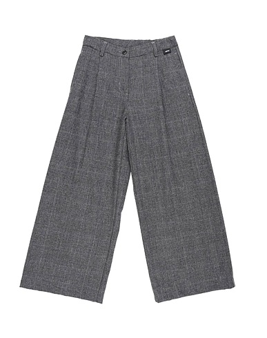 plain weave, brand logo, glen plaid, belt loops, wide leg, regular fit, zipper closure, button closing, multipockets, do not wash, dry clean with delicate solvents, do not bleach, do not tumble dry, iron at 110° c max, tailored