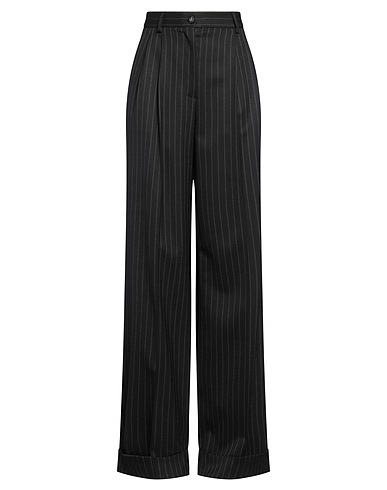 wide-leg trousers, cool wool, stretchy fabric, striped, no appliqués, high waisted, relaxed fit, zip fastening, 1 button, folded hem, multipockets, dry clean, do not bleach, do not tumble dry