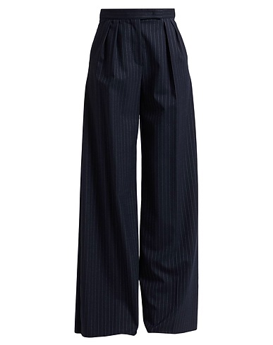 wide-leg trousers, flannel, pinstriped, no appliqués, high waisted, regular fit, zip fastening, hook fastenings, multipockets, stretch, dry clean, do not bleach, do not tumble dry