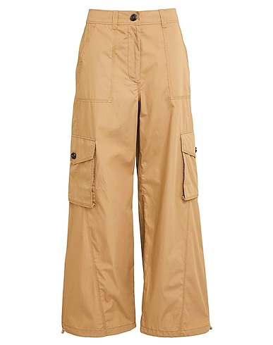 cargo trousers, poplin, plain colour, no appliqués, high waisted, belt loops, regular fit, unlined, 1 button, zip fastening, drawstring hem, patch pockets, flap pockets, machine wash or dry clean, do not bleach, do not tumble dry