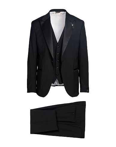 single-breasted suit, cool wool, satin, two-tone, brooch, lapel collar, long sleeves, fully lined, 1 button, multipockets, dual back vents, mid rise, belt loops, stretch, 3-piece set, dry clean, do not bleach, do not tumble dry