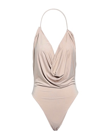 synthetic jersey, stretchy fabric, solid color, open back, draped neckline, sleeveless, fully lined, dry clean, do not bleach, do not tumble dry
