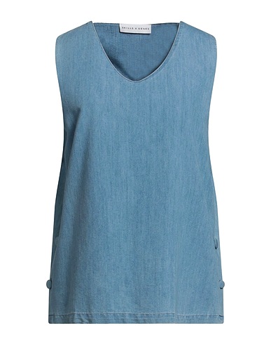 denim, faded, no appliqués, solid color, light wash, v-neck, sleeveless, button fastenings, no pockets, top