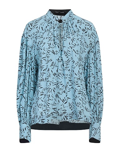 top, crepe, two-tone, no appliqués, mandarin collar, long sleeves, snap-fastening cuffs, button fastenings, dry clean, do not bleach, do not tumble dry