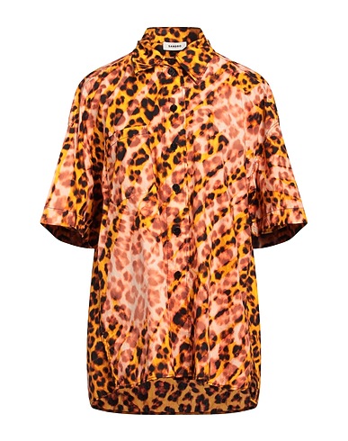 woven, no appliqués, leopard-print, classic collar, short sleeves, button fastenings, one chest pocket, long shirt