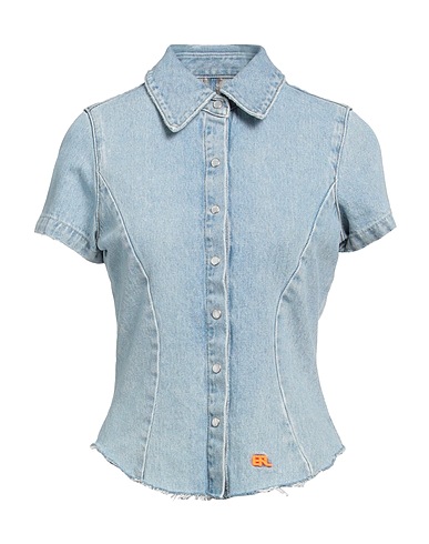 denim, brand logo, solid color, light wash, classic collar, short sleeves, snap fastenings, no pockets, machine wash or dry clean, tumble dry